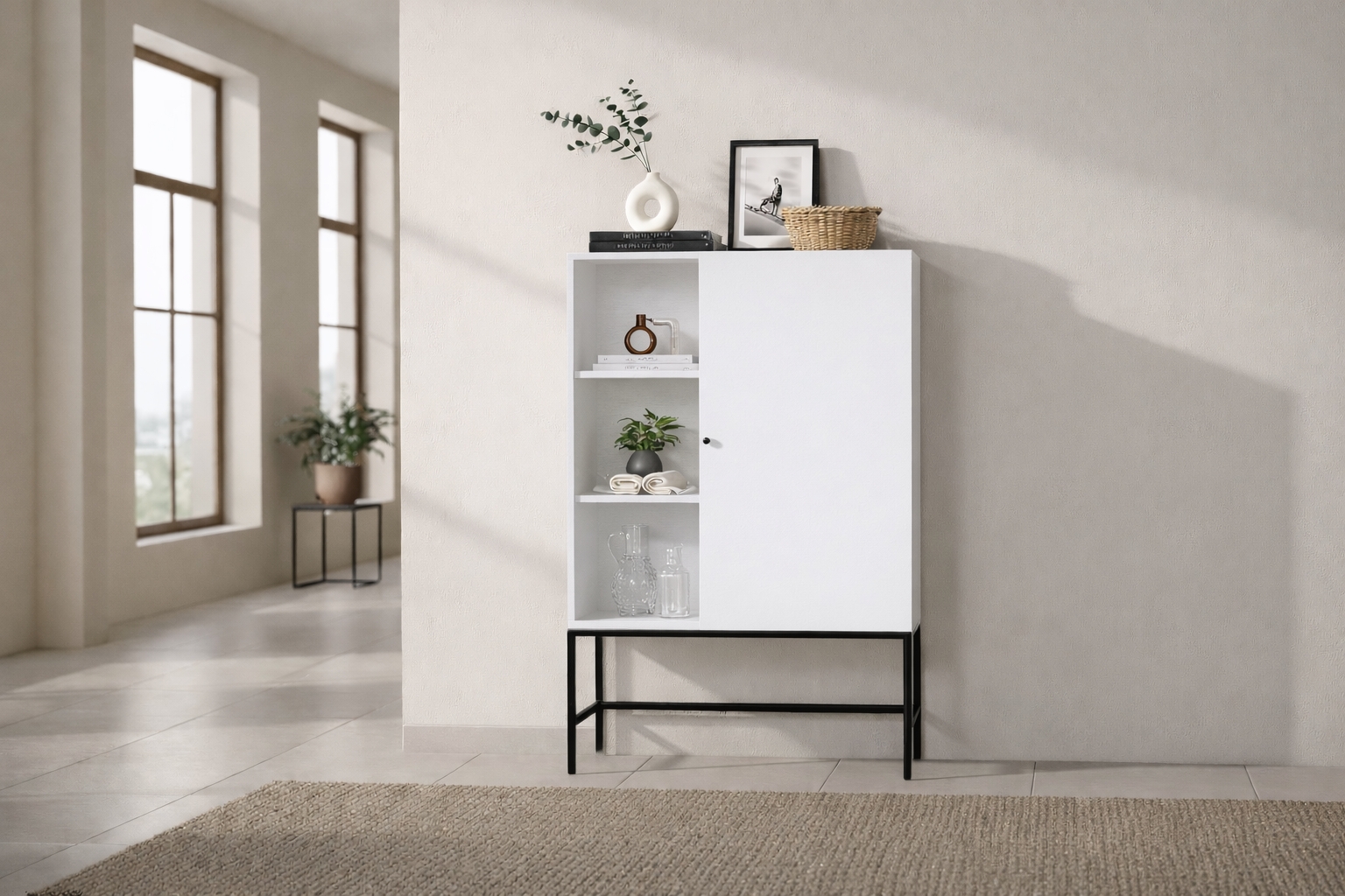 Highboard Brooklyn i vitmålad MDF är en stilren och funktionell förvaringsmöbel som passar i vardagsrum, matsal eller hall. Den kombinerar öppen och dold förvaring och ger rummet ett ljust och modernt uttryck.