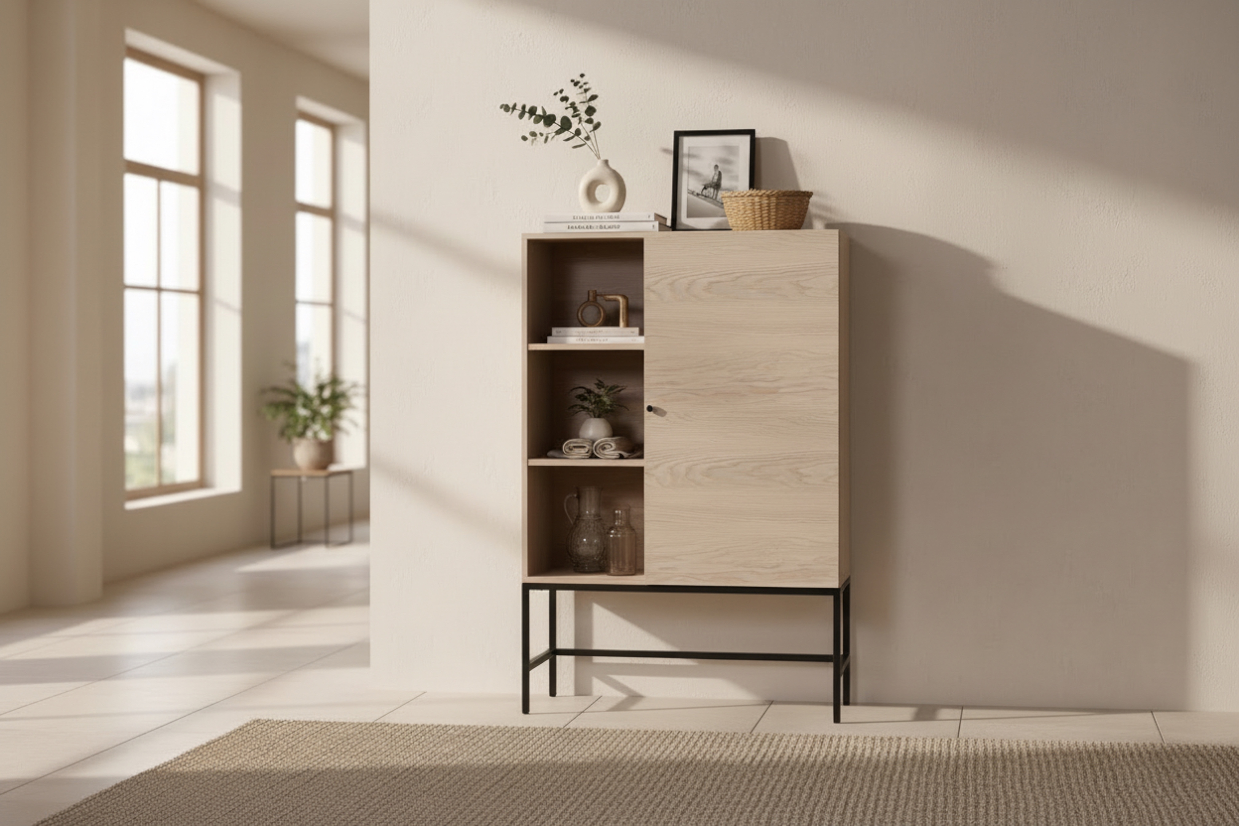 Skåpet är utrustat med öppna hyllplan för böcker, inredningsdetaljer eller serveringsföremål samt en täckt sektion med dörr för förvaring av sådant du vill ha undan från insyn. Den upphöjda konstruktionen ger ett lätt och luftigt intryck samtidigt som möbeln erbjuder generöst med förvaringsutrymme.