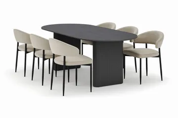Noira Ovalt Matbord 220 cm med 6 Winston Matstolar, Svart / Beige / Metallben Svart