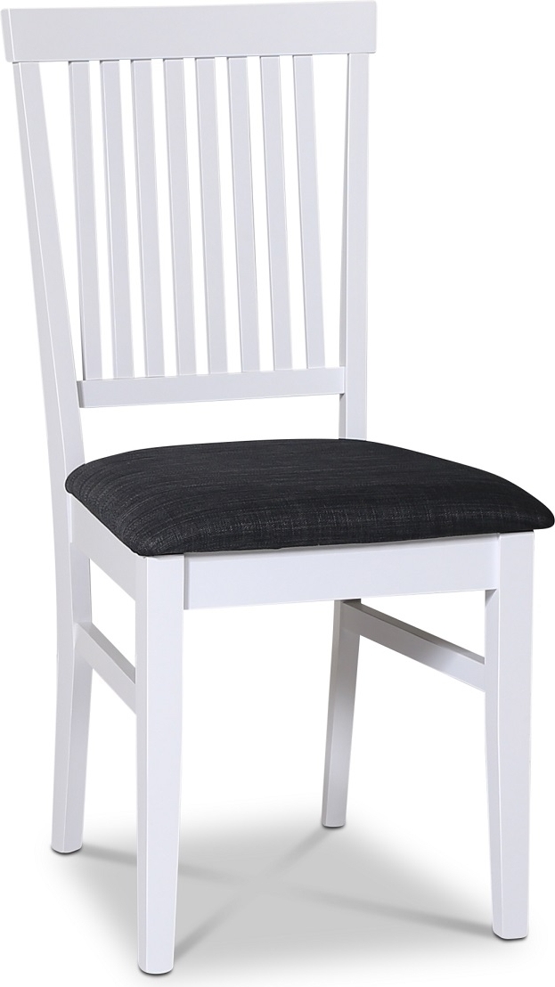 Fårö matgrupp från Skånska Möbelhuset, klassiskt matbord 180x90 cm med vitt underrede och en toppskiva i oljad ekfanèr. Det ingår 6 stycken matchande Fårö matstolar med ribbor i ryggen och sits i grått tyg. Stol i vitlackat trä.