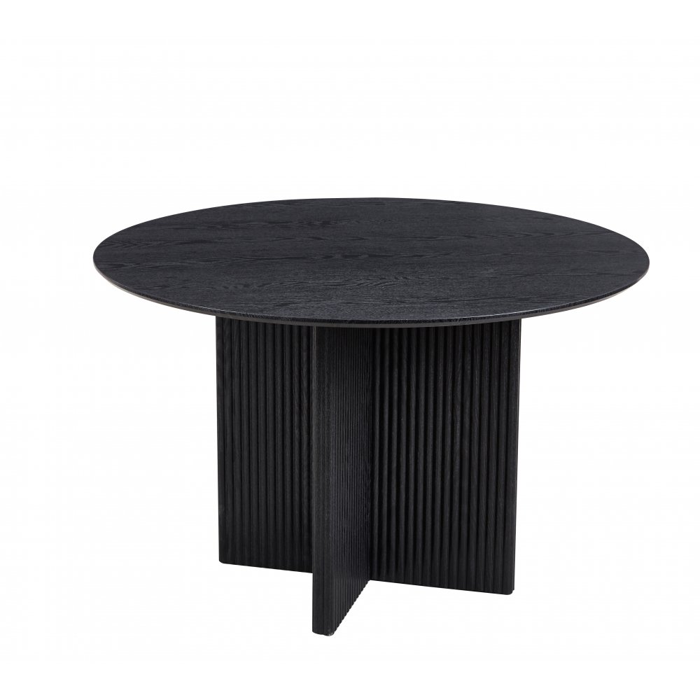 En modern och stilren matgrupp som kombinerar exklusiv design med mjuka materialkontraster. Crossby matbord har en rund bordsskiva i svartbetsad ekfolierad MDF och dekorativa räfflade bordsben i trä, vilket ger ett elegant och karaktärsfullt uttryck. Den mörka ytan ger en sofistikerad känsla som gör bordet till hemmets naturliga mittpunkt – perfekt för både vardag och fest.