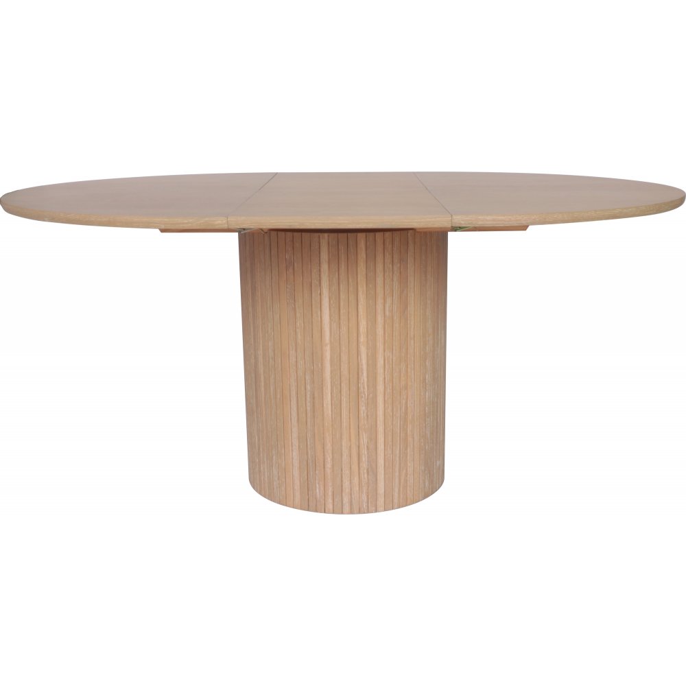 Matbordet är Ø115 cm i diameter, det ingår en tilläggsskiva som förlänger bordet till 160 cm. Iläggsskivan är vikbar och förvaras i bordets mittdel när den inte används. Bordet är byggt både i massivt trä och Fanèr.