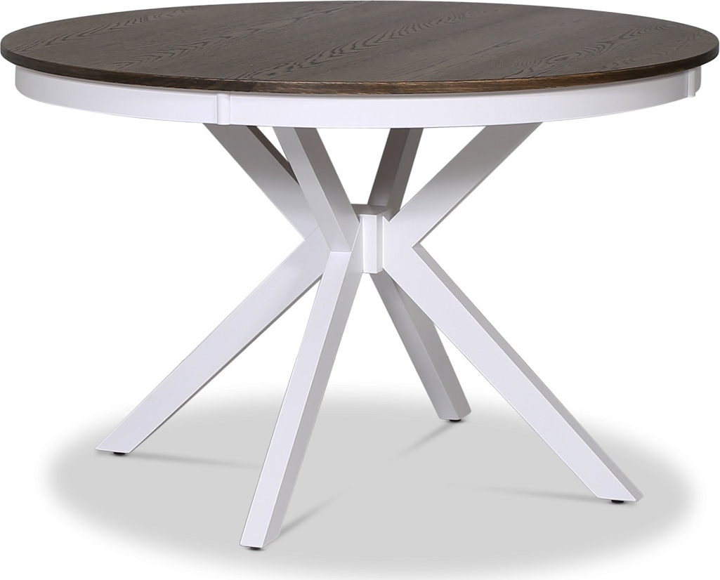 Skagen matbord med rund snygg bordsskiva i brunoljad ek-fanèr. Vitlackat underrede.