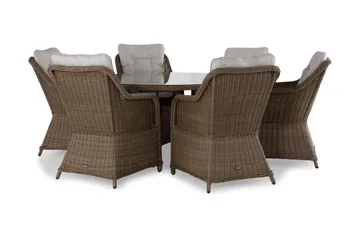 En utematgrupp är designad för att passa in i olika miljöer och för att tåla skiftande väderlek. Därför har de en ren och elegant design. Vill du ge din matgrupp ute en personlig känsla och göra den mjukare kan du lägga vackra prydnadskuddar på stolarna och avsluta med en dekorativ bordsduk, blommor och lite levande ljus.